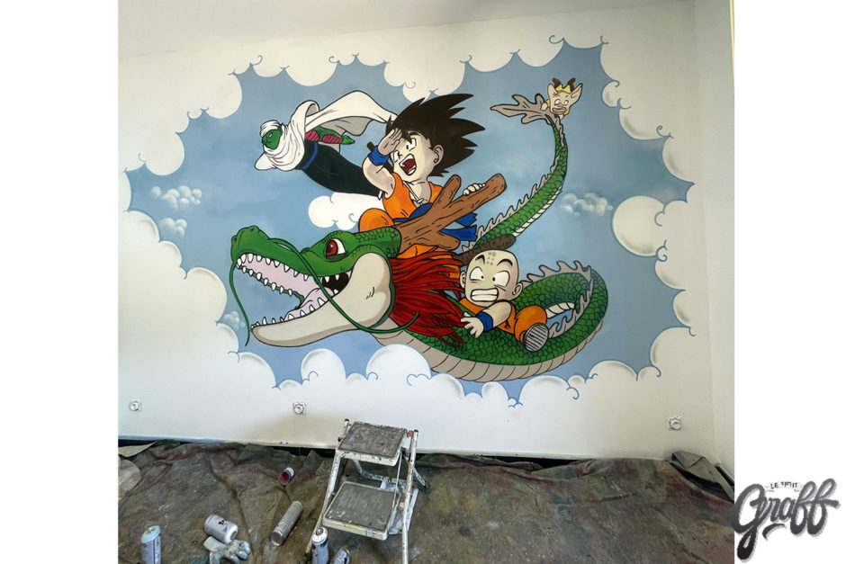 Dans cette pièce, la décoration est sublimée par une magnifique fresque murale personnalisée sur le thème de Dragon Ball. L’artiste a su créer une œuvre de style graffiti, mêlant couleurs vives et dynamisme, pour représenter les héros emblématiques : Goku, Piccolo, Krilin et Shenron. Cette déco graffiti donne vie au mur, capturant l’énergie et l’esprit d’aventure de la série. La fresque, conçue sur mesure, reflète la passion pour l’univers de Dragon Ball tout en apportant une touche moderne et artistique à la pièce. Un véritable hommage aux guerriers légendaires, qui ravira à coup sûr tous les fans et apportera une ambiance unique et inspirante à la décoration.
